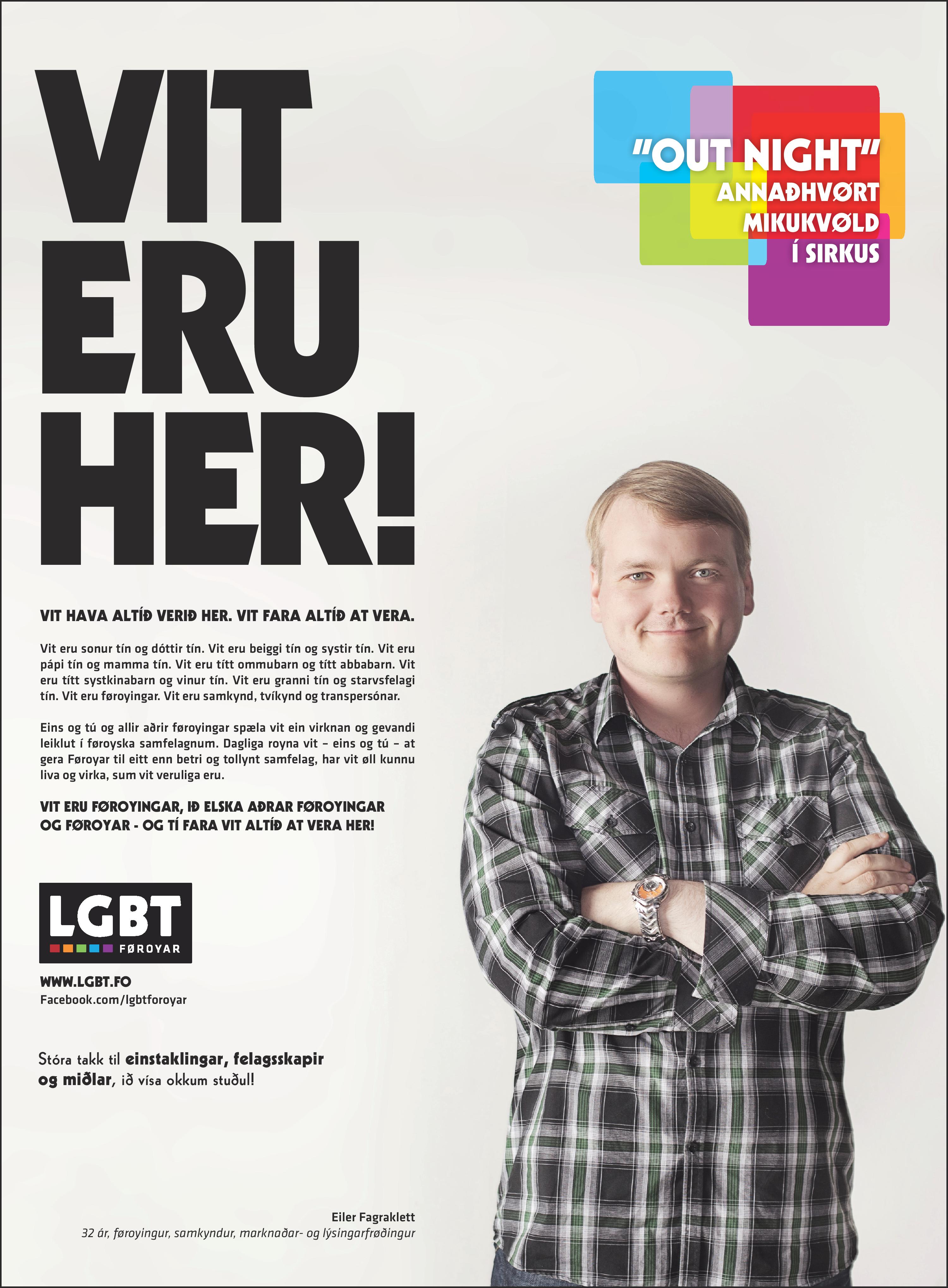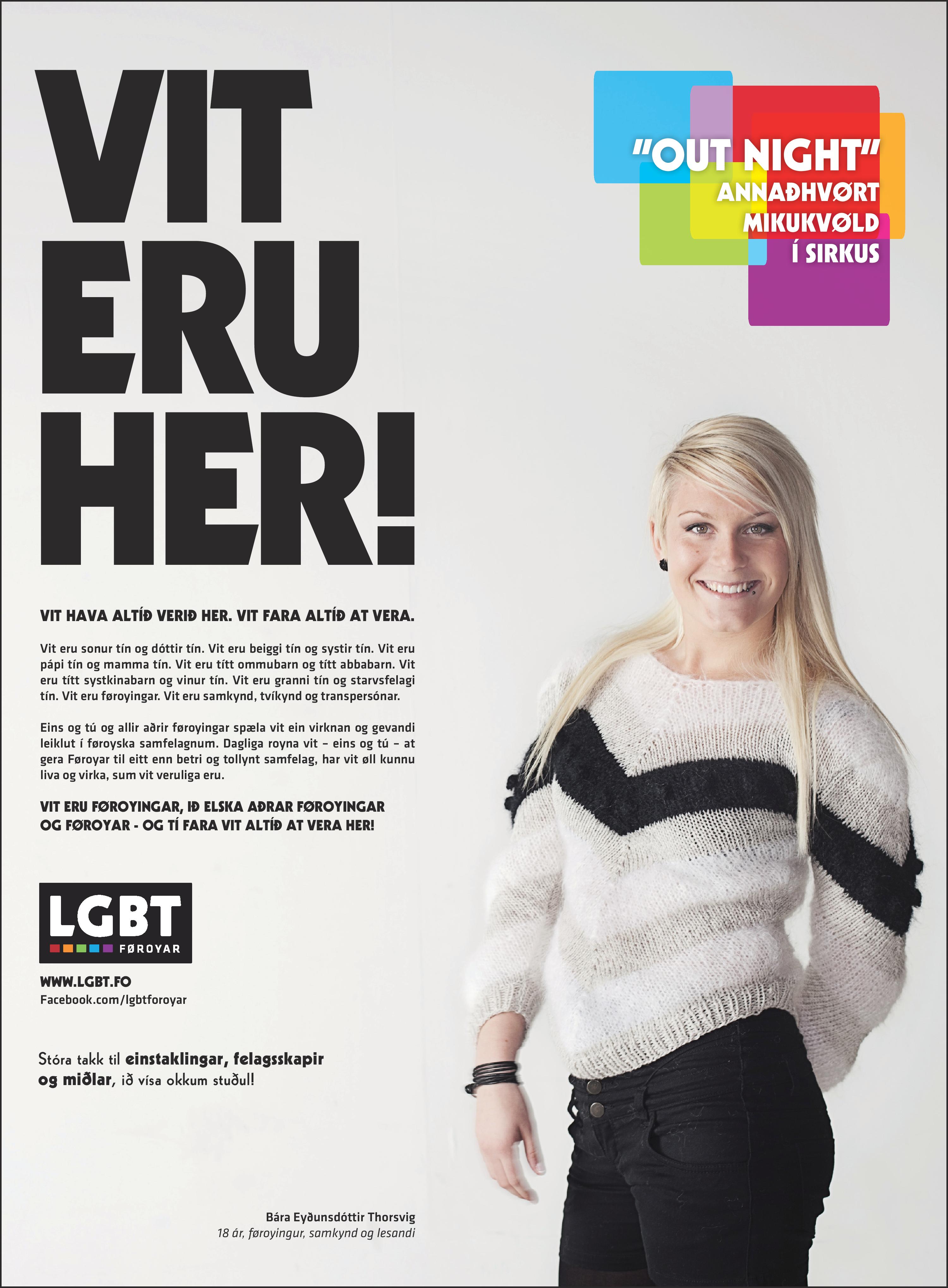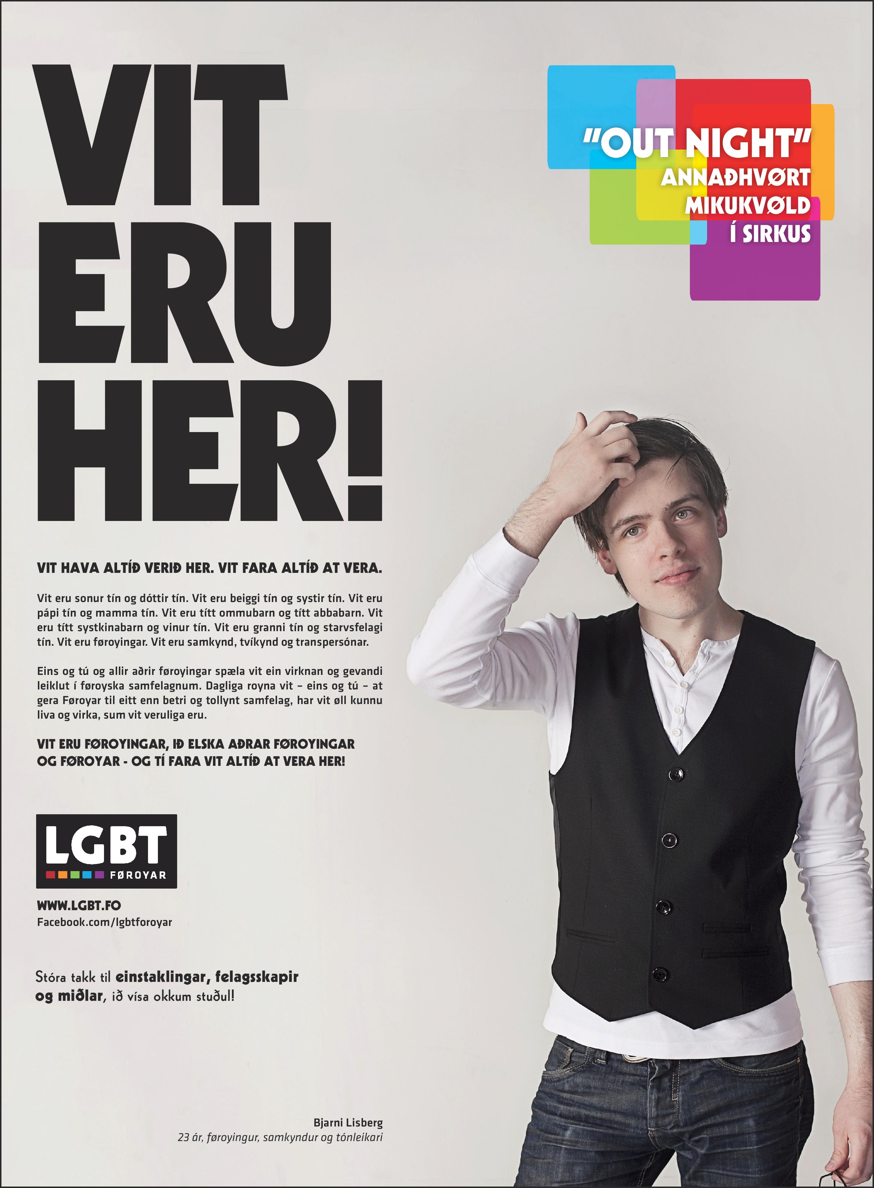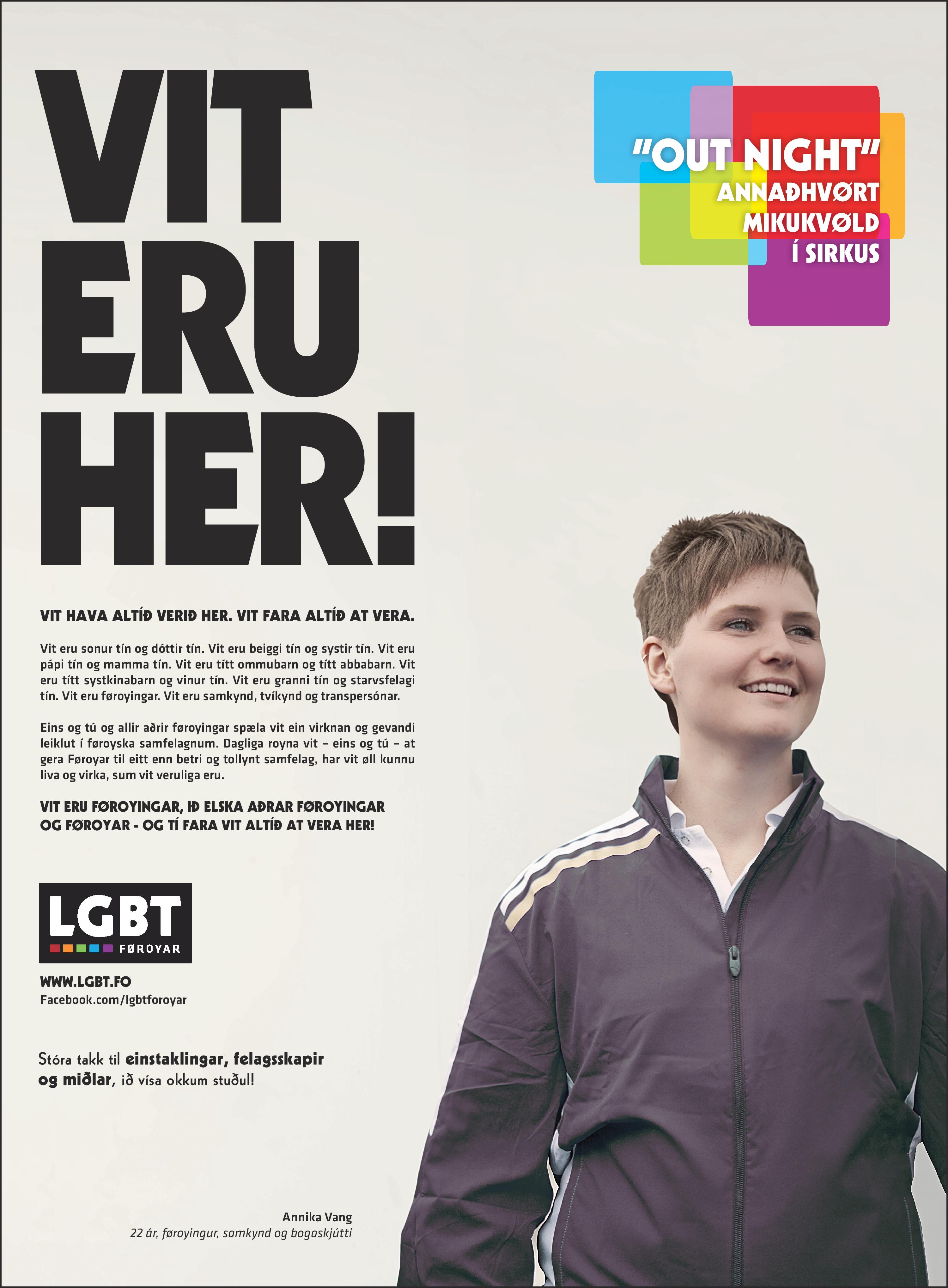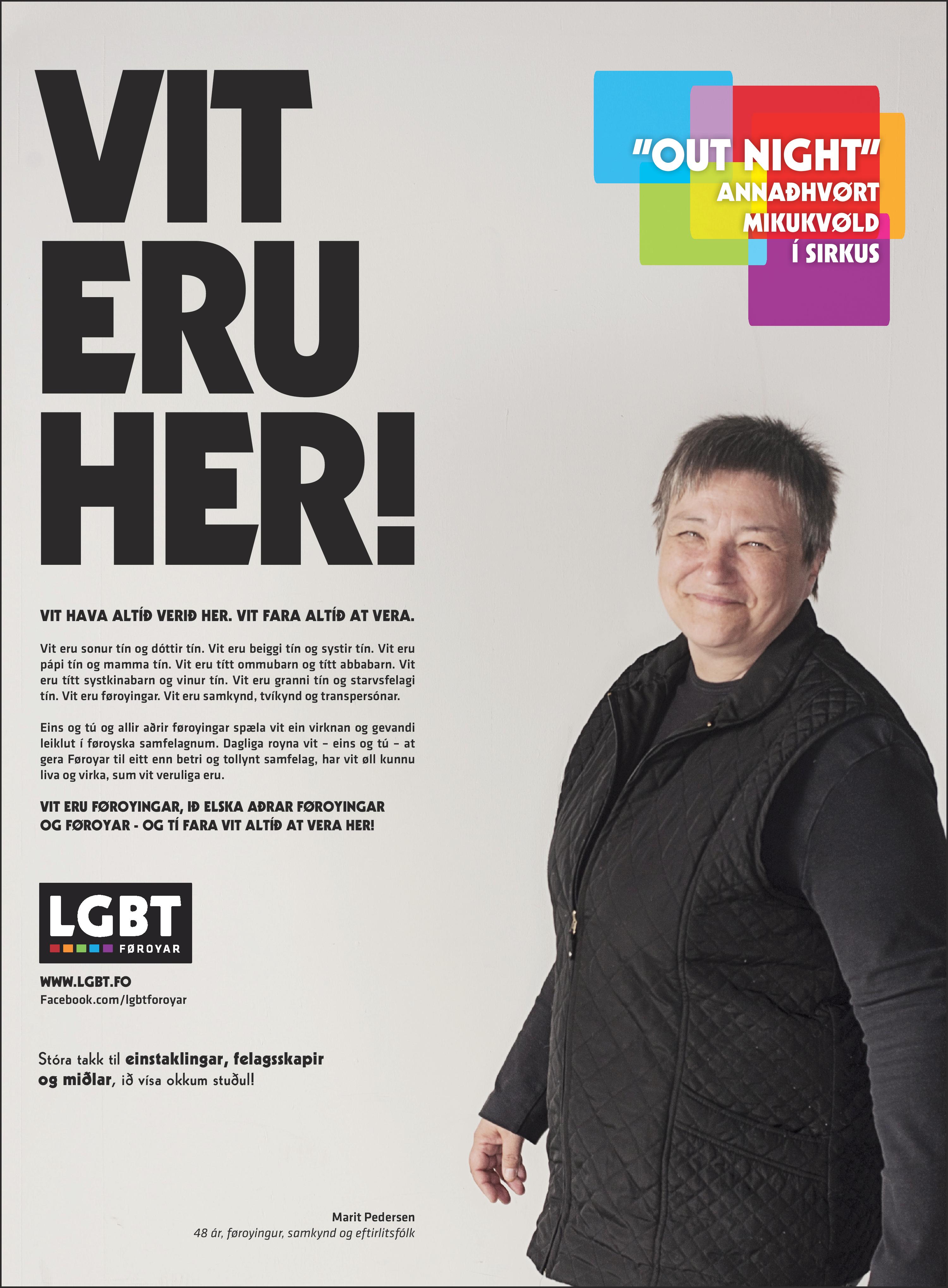 Vit eru tín sonur og tín dóttir. Vit eru tín beiggi og tín systir. Vit eru tín faðir og tín móðir. Vit eru títt ommubarn og títt abbabarn. Vit eru títt systkinabarn og tín vinur. Vit eru tín granni og tín starvsfelagi. Vit eru føroyingar. Vit eru samkynd, tvíkynd og transpersónar.